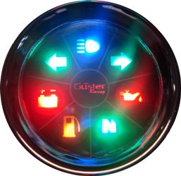 Indica através de símbolos as funções como: Pisca alerta (verde); Sinaleira esquerda (verde); Sinaleira direita (verde); Farol alto (azul); freio (vermelho); Bateria (vermelho); Neutro (verde); Reserva de combustível (amarelo).