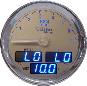 Apresenta com ponteiro, a rotação do motor em RPM e em formato digital: a temperatura de água, do óleo e tensão (Volts) (outras possibilidades, sob consulta). O sensor para giro pode ser instalado na bobina de ignição ou nos cabos de vela (SG-10, indutivo), sem interferência no veículo.