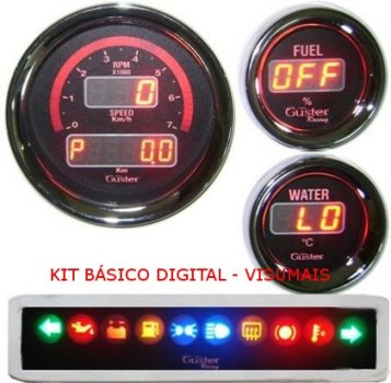 KIT PAINEL 1 - Composto por 4 instrumentos. Multifuncional 85mm MF-70 STREET Apresenta leds progressivos a rotação do motor em RPM. O sensor para giro é opcional e pode ser instalado na bobina de ignição ou nos cabos de vela (ver SG-10, indutivo), sem interferência no veículo. CARACTERÍSTICAS -Circuito eletrônico com microprocessador, usando tecnologia SMD, resultando em mais confiabilidade, durabilidade e mais recursos ao usuário; -Não contém peças mecânicas sujeitas a desgastes e aferições periódicas -A utilização de mostrador digital permite visualização rápida; -Indicado para montagem em painéis ou suportes/copos automotivos; -Fabricado com o diâmetro de 85mm; -Alimentação: 8 a 15VDC; -Para veículos carburados ou injetados; -Para motores de 1, 2, 4, 6, 8, 10 ou 12 cilindros, gás, gasolina, álcool ou diesel; -Proteção quanto a inversão de polaridade da alimentação; -Sensores inclusos ou não, para sua comodidade e menor custo; -Inclusos: Sensor SV-10 com ímã e manual.