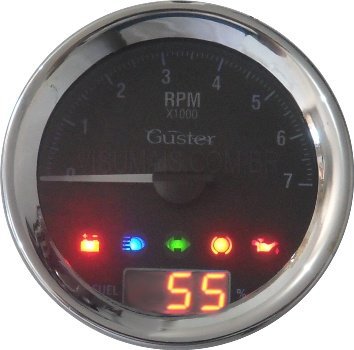 Apresenta com ponteiro (tecnologia STEEP) a rotação do motor em (0 a 4000RPM). Em formato digital o indicador de combustível e em leds de alto brilho o indicador de sinais. O sinal para o contagiros pode ser pego direto da central (injetados) ou do pulsante da bobina de ignição ou ainda direto da vela (sensor SG-10). Não interfere no veículo. O indicador de combustíveis necessita que a boia (não inclusa) seja resistiva (0 a 500 ohms) e ligada apenas neste aperelho. O indicador de sinais mostra: Se a bateria está sendo carregada - led vermelho. Farol alto ligado - led azul. Sinaleira (direita ou esquerda) - led verde. Freio - led vermelho. Pressão do óleo - led vermelho. Outras configurações podem ser implementadas, consulte-nos.