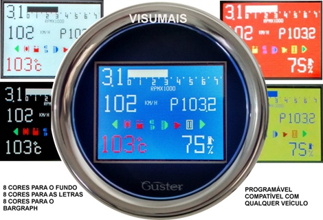 -Circuito eletrônico com microprocessador, usando tecnologia SMD, resultando em mais confiabilidade, durabilidade e mais recursos ao usuário; -A utilização de mostrador digital em tela de cristal líquido permite visualização rápida e precisa; -Brilho ajustável. -Oito opções de cores de fundo e fontes; -Não contém peças mecânicas sujeitas a desgastes e aferições periódicas; -Indicado para montagem em painéis ou suportes/copos automotivos; -Fabricado com odiâmetro de 85mm. Adaptável em suporte/copo automotivo de 85mm; -Alimentação: 8 a 18VDC, para veículos 12 Volts. Para 24 Volts ou outras redes elétricas, ver opcionais; -Para veículos carburados ou injetados; -Para motores de 1, 2,4, 6, 8, 10 ou 12 cilindros, gás, gasolina, álcool ou diesel; -Proteção quanto a inversão de polaridade da alimentação; -O sensor opcional Guster (SG-10, indutivo) acoplado ao cabo de velas facilita a instalação. ITENS FORNECIDOS COMO PADRÃO