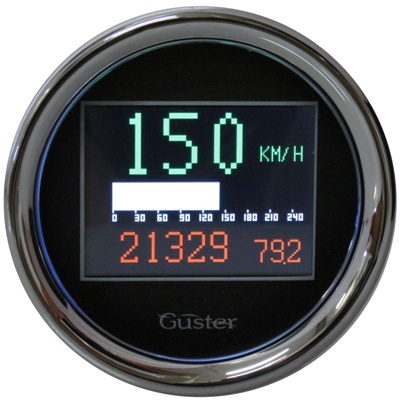 Apresenta no formato digital e em bargraph a velocidade, odometro total e parcial.