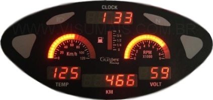 -Circuito eletrônico com microprocessador, usando tecnologia SMD, resultando em mais confiabilidade, durabilidade e mais recursos ao usuário; -A utilização de mostrador digital permite visualização rápida e bonito acabamento; -Proteção quanto a inversão de polaridade da alimentação; -O próprio usuário, com algum conhecimento, pode instalar o produto; -Cor de leds e displays: vermelho, azul, verde ou amarelo; -Com iluminação traseira nas escalas; -Alarme programável pelo usuário para voltímetro e temperatura; -Dimensões do circuito eletrônico: (133x83)mm. Nesse circuito estão montados os leds e displays. O Indicador de Sinais (luz alta, etc) não fazem parte do circuito.