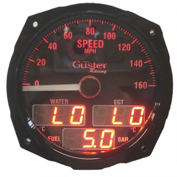 Apresenta com ponteiro, a velocidade em MPH e em formato digital: a temperatura da água, pressão do combustível e a temperatura (EGT) da câmara de combustão (cilindro). Com memória, apresentando a temperatura máxima gerada. Nossos velocímetros permitem avaliar baixas velocidades com precisão. Esta configuração foi montada para aviação experimental. Outras configurações podem ser implementadas: Veja modelo MF-13;