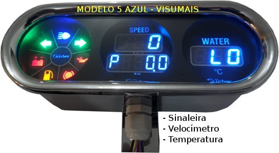 Apresenta em painel no formato oval informações de velocídade com odômetro, temperatura e indicações de sinais. Gabinete preto ou cromado.