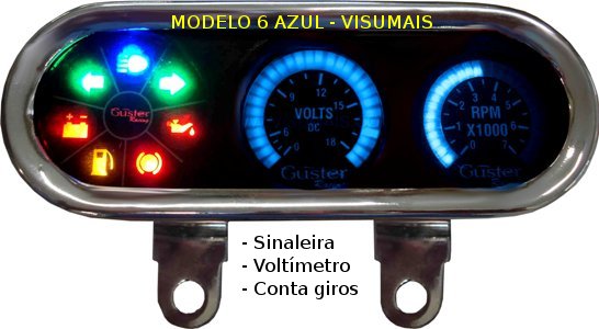 Apresenta em painel no formato oval informações de conta giros, tensão da bateria e indicações de sinais. Gabinete preto ou cromado.