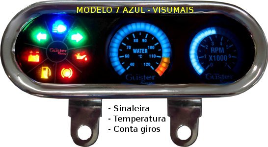 Apresenta em painel no formato oval informações de conta giros, temperatura e indicações de sinais. Gabinete preto ou cromado.