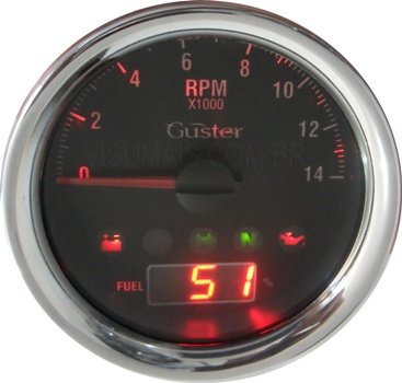 Apresenta com ponteiro (tecnologia STEEP) a rotação do motor em (0 a 14000RPM). Em formato digital o indicador de combustível e em leds de alto brilho o indicador de sinais. O sinal para o contagiros pode ser pego direto da central (injetados) ou do pulsante da bobina de ignição ou ainda direto da vela (sensor SG-10). Não interfere no veículo. O indicador de combustíveis necessita que a boia (não inclusa) seja resistiva (0 a 500 ohms) e ligada apenas neste aperelho. O indicador de sinais mostra: Se a bateria está sendo carregada - led vermelho. Farol alto ligado - led azul. Sinaleira (direita ou esquerda) - led verde. Freio - led vermelho. Pressão do óleo - led vermelho. Outras configurações podem ser implementadas, consulte-nos.