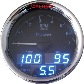Apresenta com ponteiro, a rotação do motor em RPM e em formato digital: a temperatura (água ou óleo), nível de combustível e tensão da bateria. O sensor para giro opcional pode ser instalado na bobina de ignição ou nos cabos de vela (SG-10, indutivo), sem interferência no veículo. CARACTERÍSTICAS